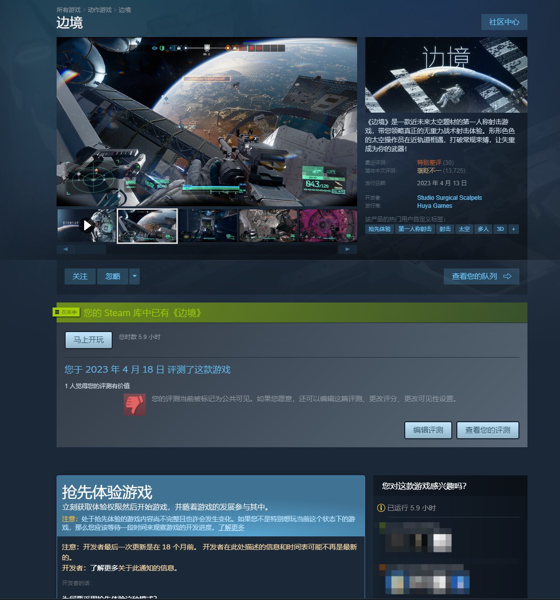 当初我是买的大杯版边境,还是预购的,想想发现我真是个傻*,几年前在逛Steam的时候发现了这款游戏,当时觉得很惊喜,太空,对战多人PVP,这很不错啊,一看是前琳琅天上工作室成员开发的游戏,更感兴趣了,一直在关注这款游戏,后面开预购了,我第一时间冲过去预购了大杯版,后来发现这个游戏没有多少模式,更新也很少,再后来逐渐停止更新了,直到24年7月被发行商宣布停止运营,所以我花的钱直接打了水漂,现在柳叶刀工作室和成员都不见了。